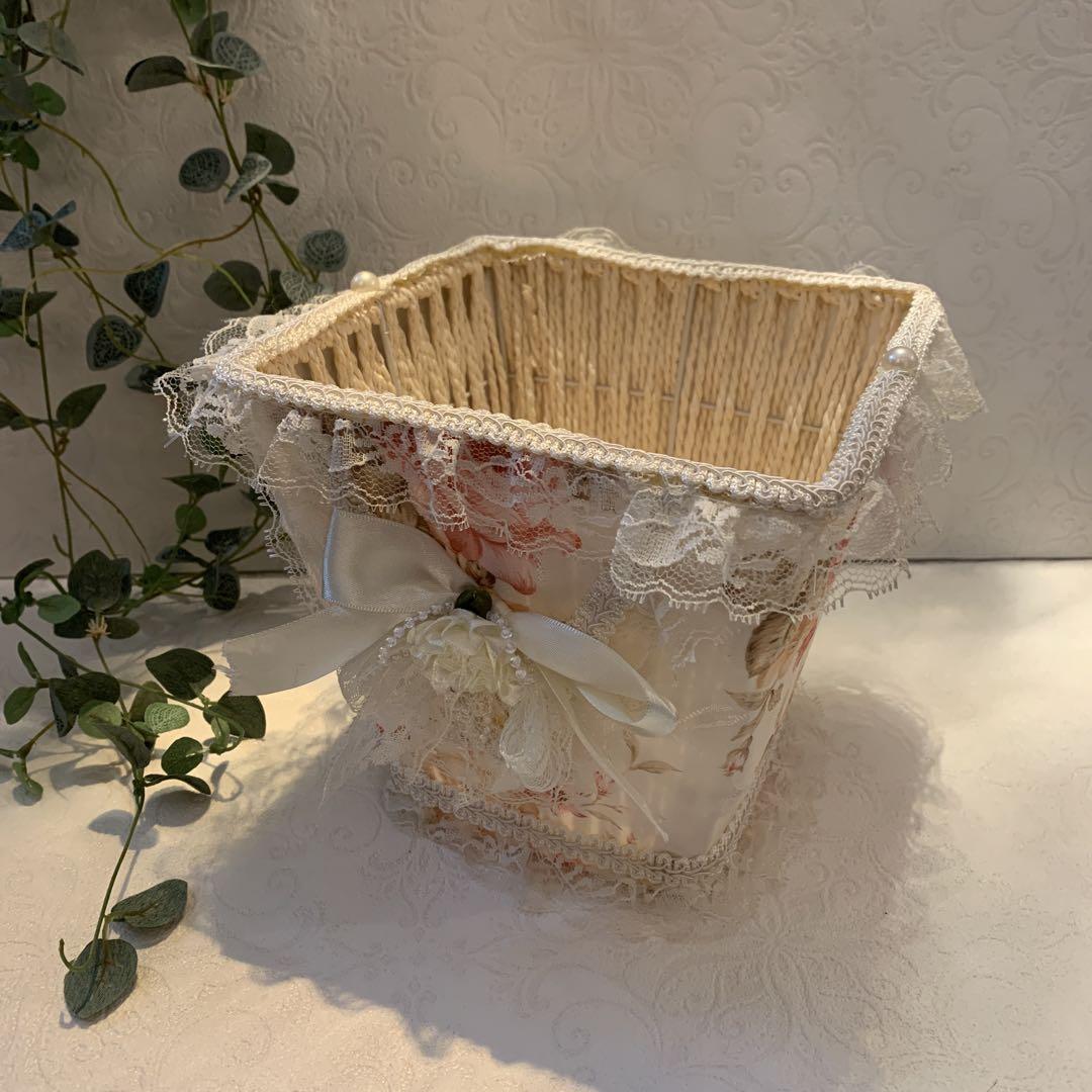 薔薇模様の生地にリボンやレースの飾りが可愛いバスケットです。